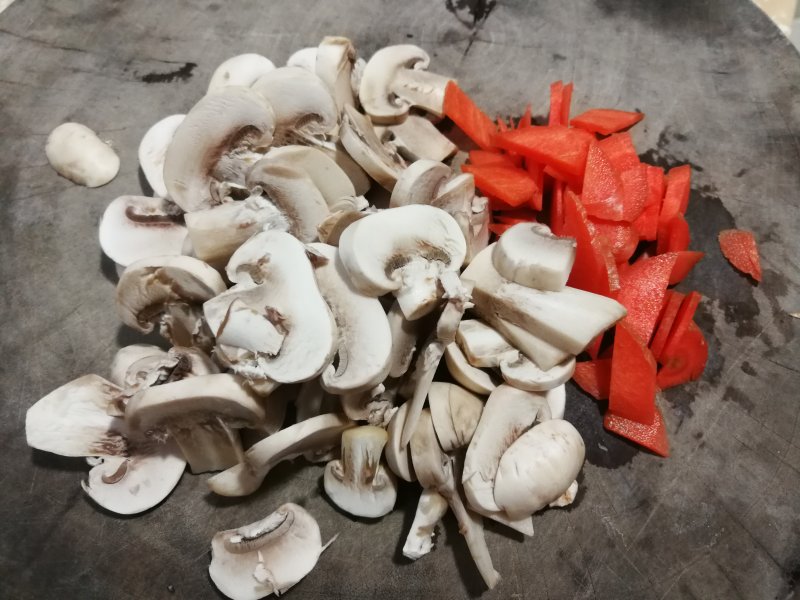 2. Using a sharp knife, carefully slice your mushrooms and carrot into thin pieces. The thinner you slice them, the faster they will cook and the more delicate the texture of your final soup will be.