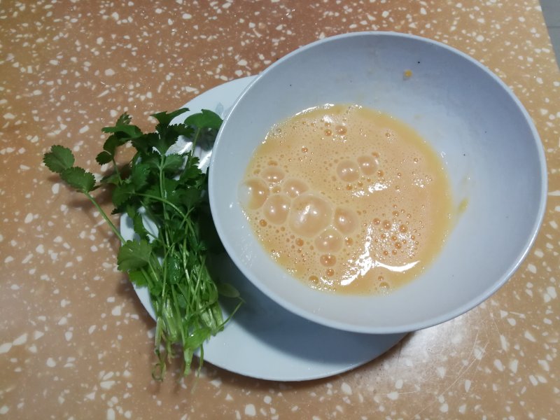 3. In a small bowl, crack the two eggs. Add the teaspoon of cooking wine and ½ teaspoon of salt. Whisk everything together until the yolks and whites are fully combined and slightly frothy. Set your chopped cilantro aside for the final step.