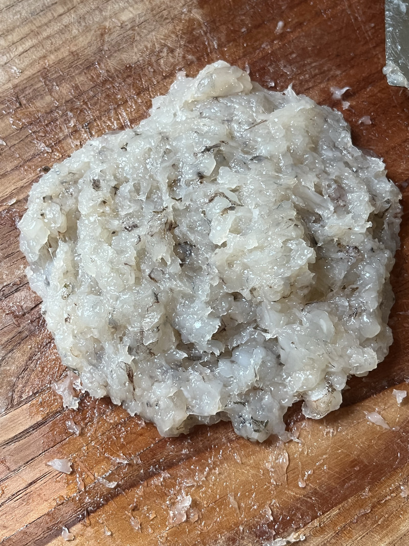 Then, using a knife, roughly chop the shrimp. You’re not aiming for a perfectly smooth paste, but rather a coarse, mashed texture.