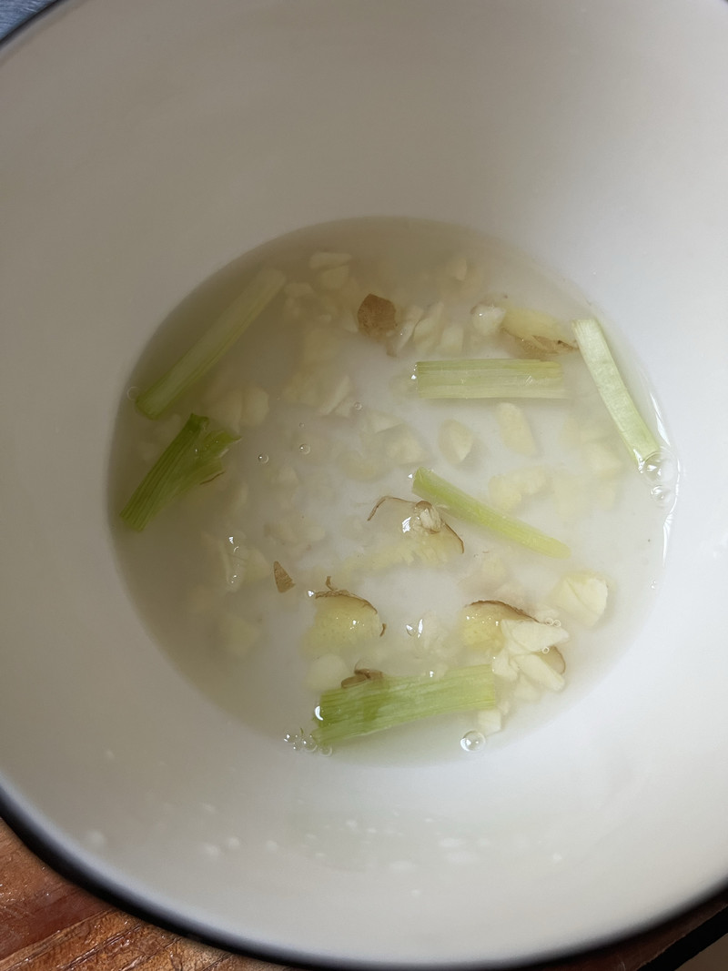 Now, for the aromatic infusion: pour in the prepared ginger, garlic, and scallion water.