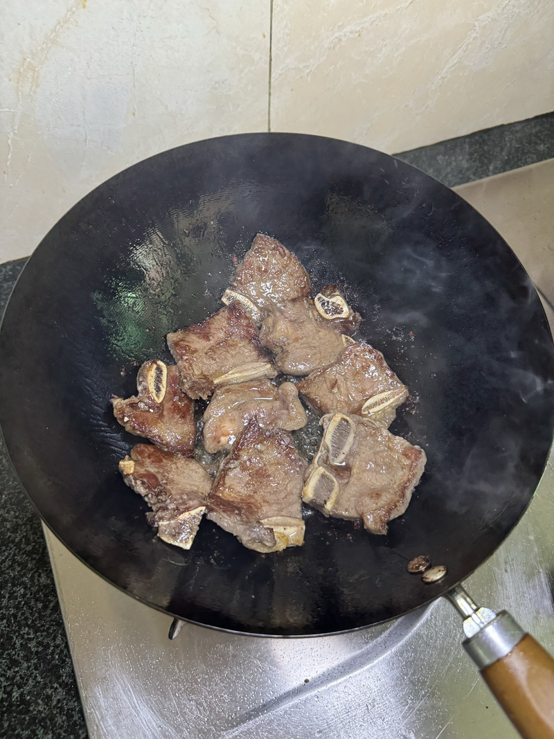 Pour in the black pepper sauce, stirring to coat the ribs evenly.