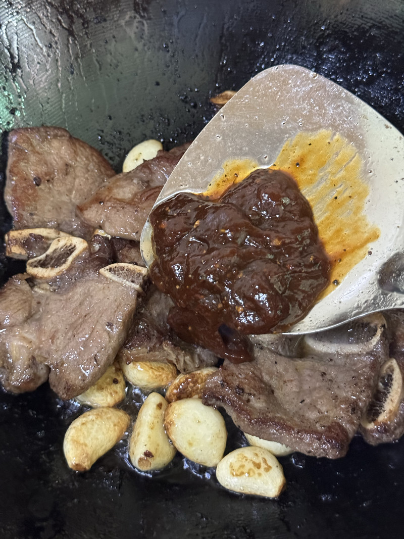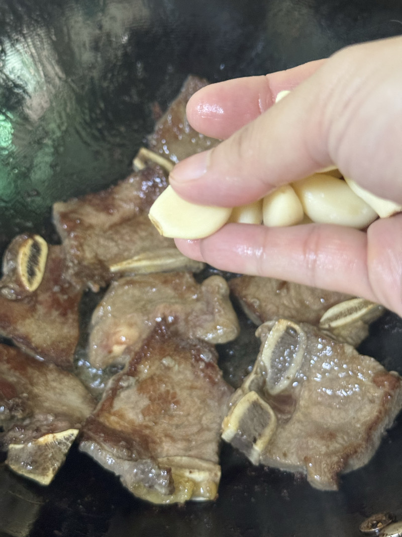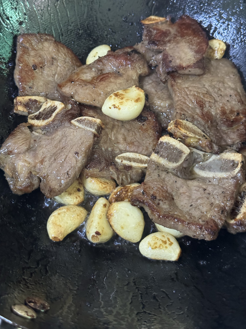 Once the ribs are seared, reduce the heat to medium and add your minced garlic to the pan.