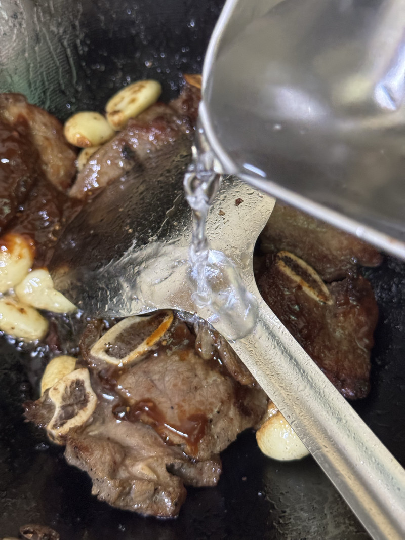 You want enough to come about halfway up the sides of the ribs. Scrape the bottom of the pan with your spoon to release all those delicious browned bits.