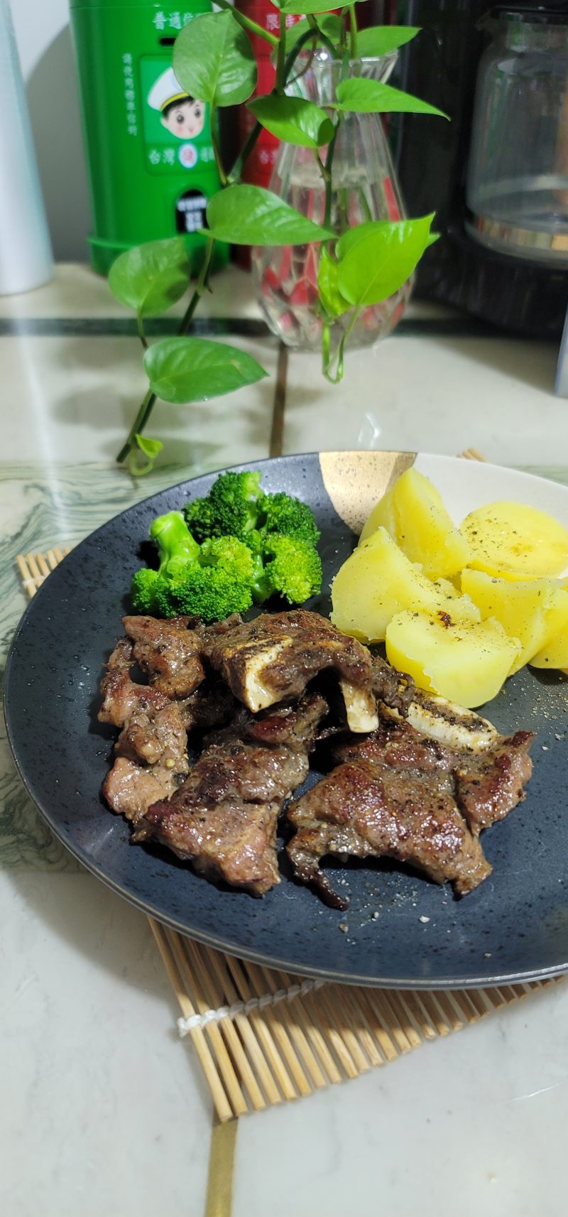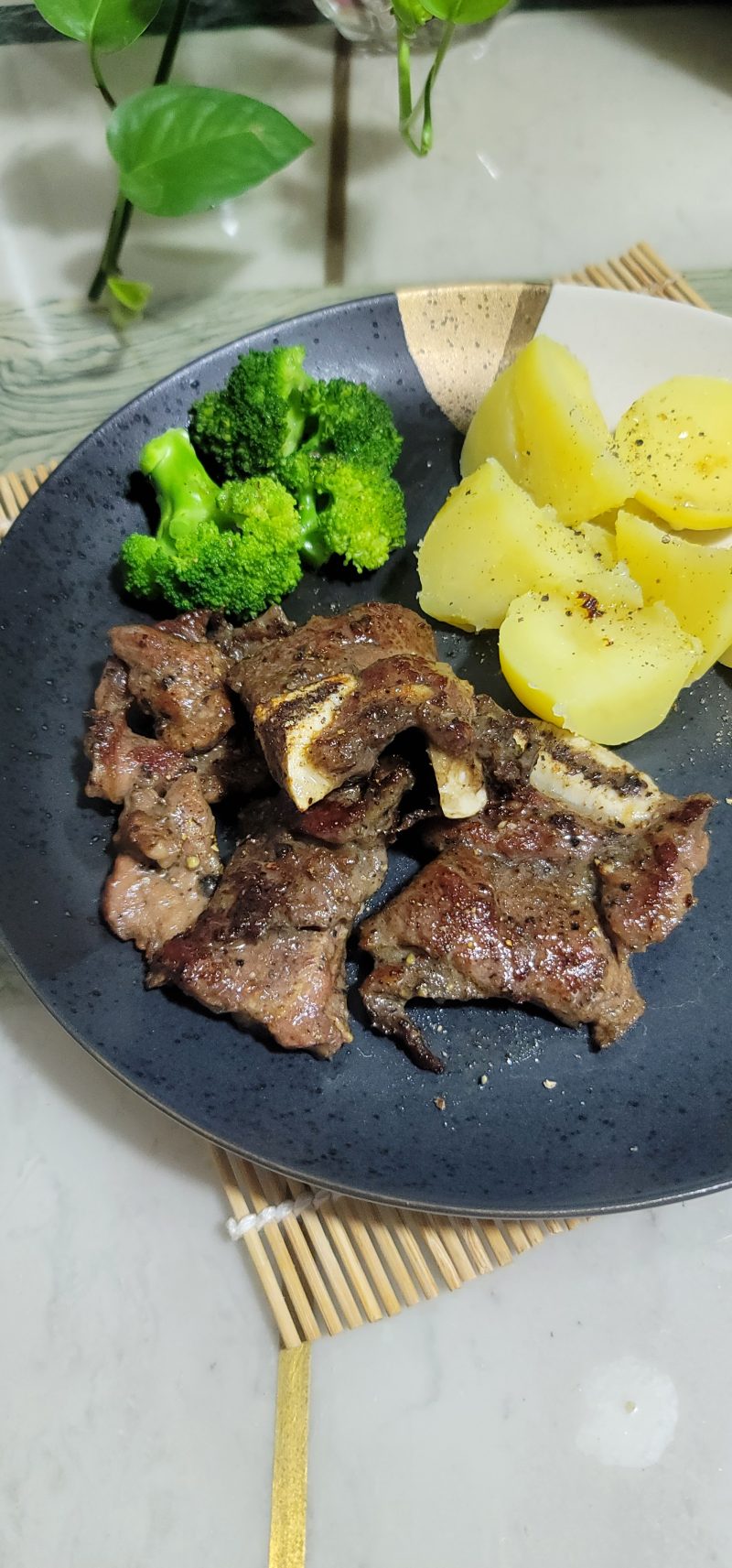 4. Once the ribs are cooked through, remove them from the pan and transfer them directly to your serving plate. Arrange your cooked potato chunks and broccoli florets alongside the ribs. This simple pairing creates a complete, balanced, and visually appealing meal. It’s the perfect one-person feast!