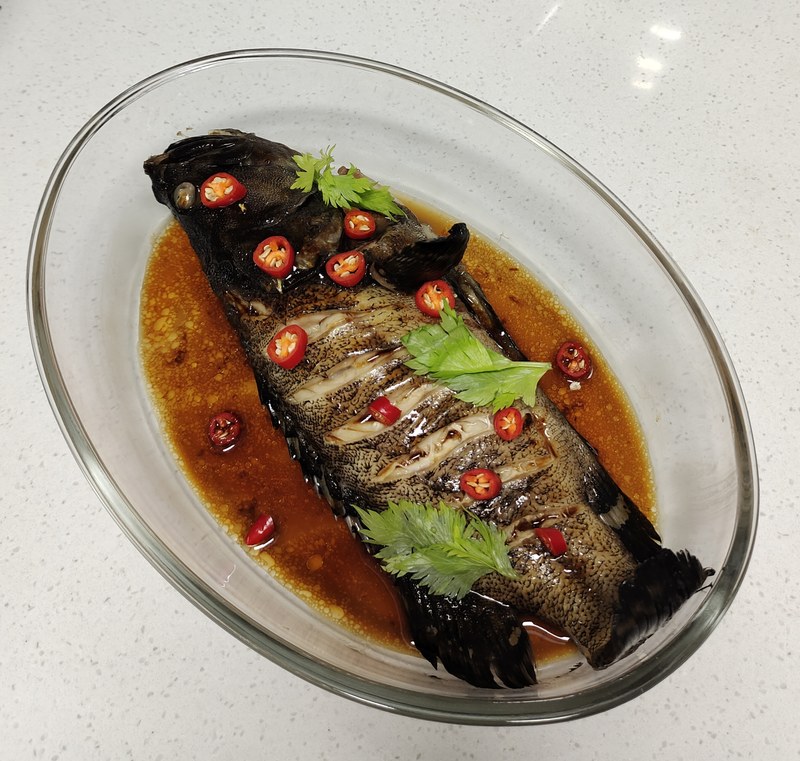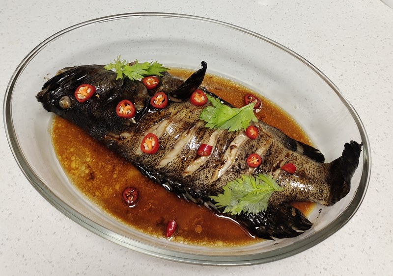 Garnish and Sauce: Artfully scatter the julienned ginger, sliced red chili rings, and celery leaves (or cilantro/scallions) over the top of the hot fish. Drizzle the seasoned soy sauce mixture around the base of the fish on the plate.