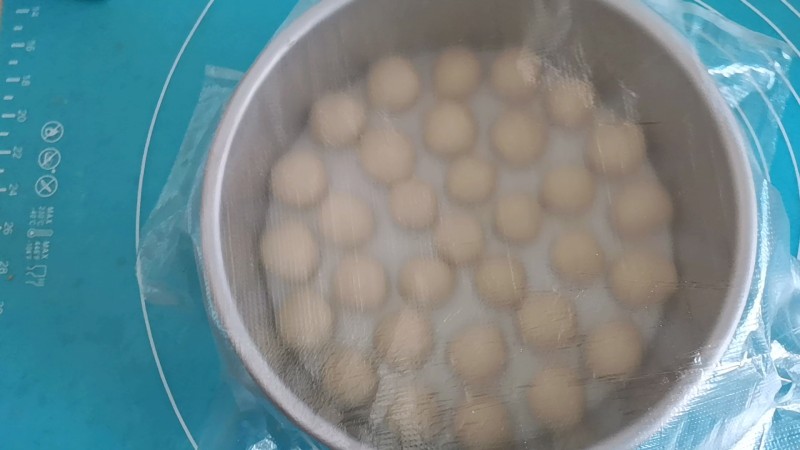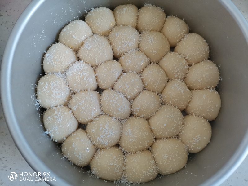 9. Lightly grease an 8-inch (20 cm) round cake pan. A chiffon pan with a central tube, as shown in the photo, is also perfect. Arrange the small dough balls in the pan. They don’t have to be perfectly spaced, as they will expand to fill the gaps.