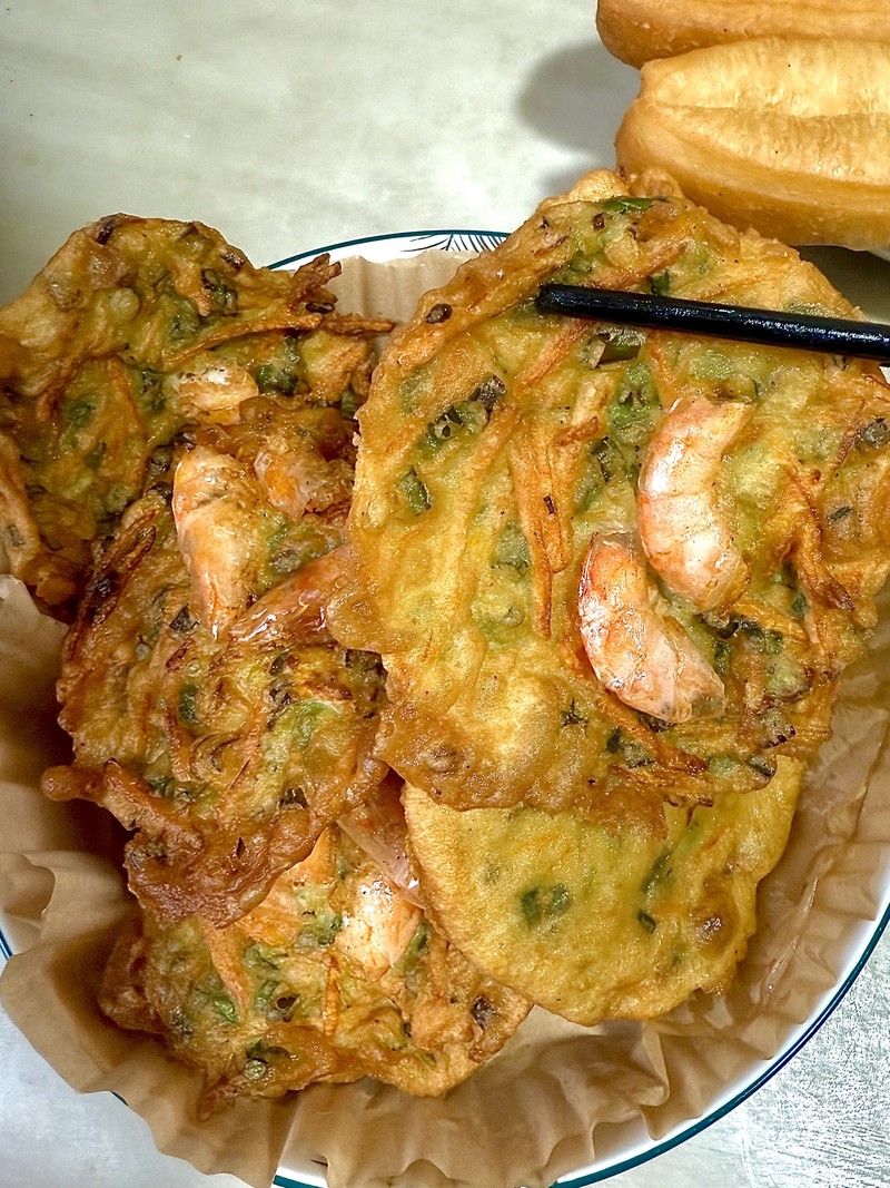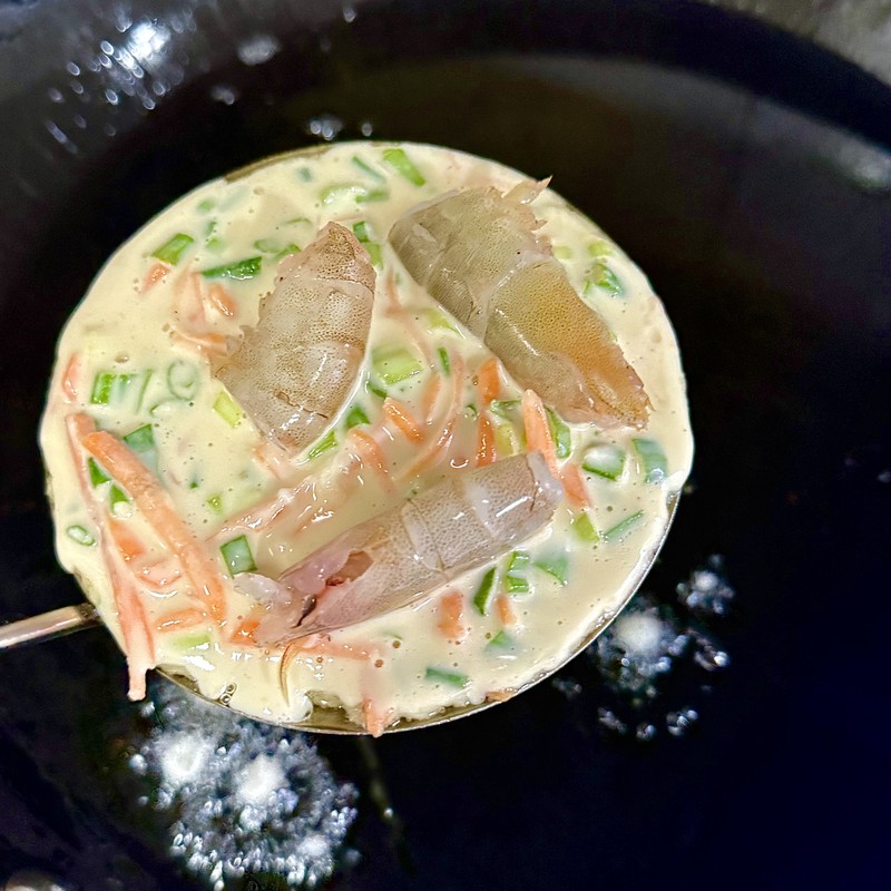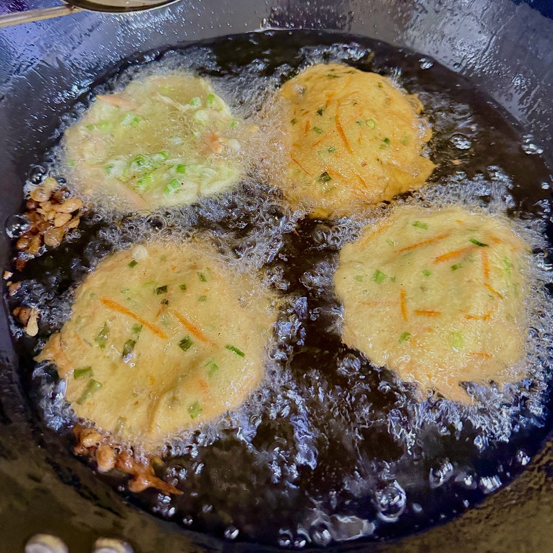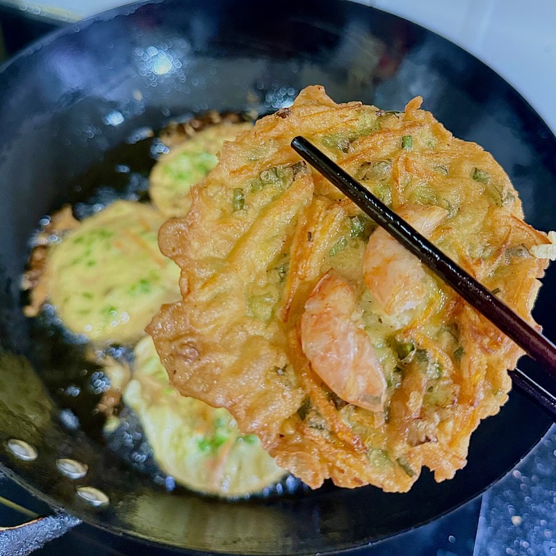 In a wok, deep skillet, or heavy-bottomed pot, pour in enough oil to have a depth of at least 1.5 inches. Heat the oil over medium to medium-high heat until it reaches around 350°F (175°C). If you don’t have a thermometer, you can test it by dropping a tiny amount of batter into the oil. If it sizzles vigorously and floats to the surface, the oil is ready. Using a tablespoon, carefully scoop up the batter with a few shrimp and drop it into the hot oil. Be careful not to overcrowd the pan; fry in batches of 4-5 fritters at a time.
