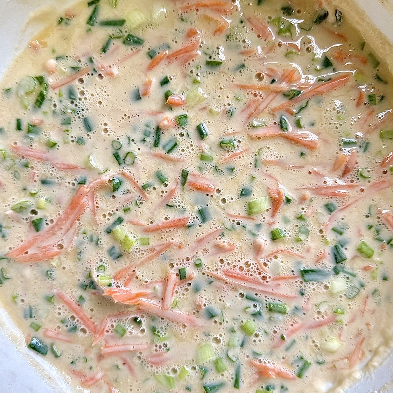 In a medium-sized mixing bowl, combine the all-purpose flour, glutinous rice flour, five-spice powder, and salt. Give it a quick whisk to mix everything together. Then, add the beaten egg, shredded carrot, and chopped scallions. Gradually pour in the cold water while stirring, stopping when you achieve a thick batter that has the consistency of Greek yogurt. Don’t overmix; a few small lumps are perfectly fine.
