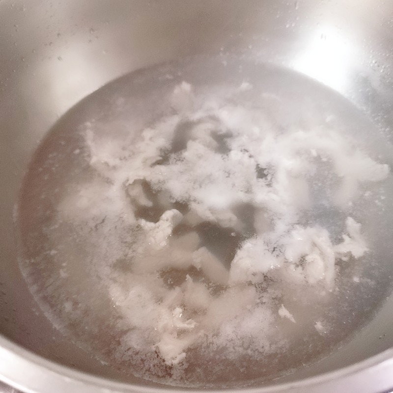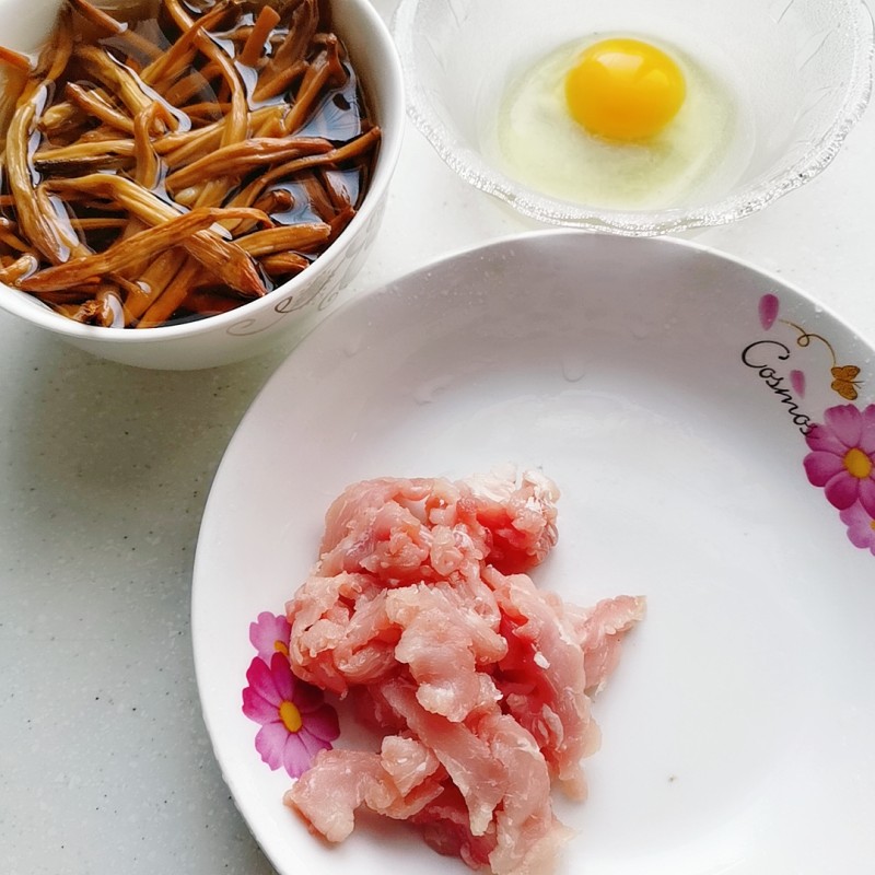 While the flowers are soaking, slice the lean pork into very thin bite-sized pieces. Crack the egg into a small bowl. Once the daylily flowers are soft, drain them and rinse them well under cool water.