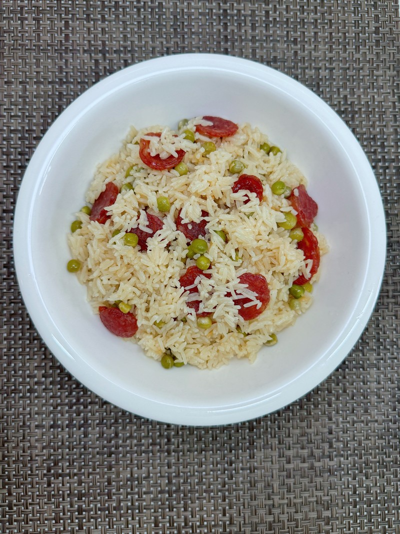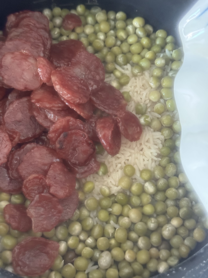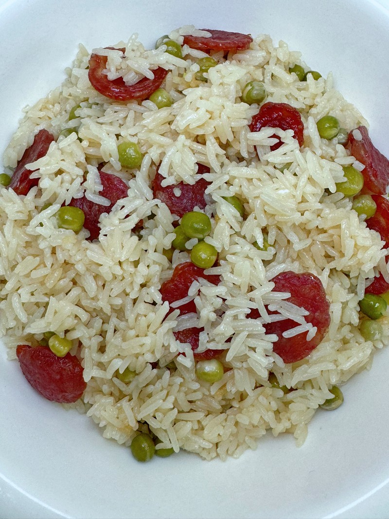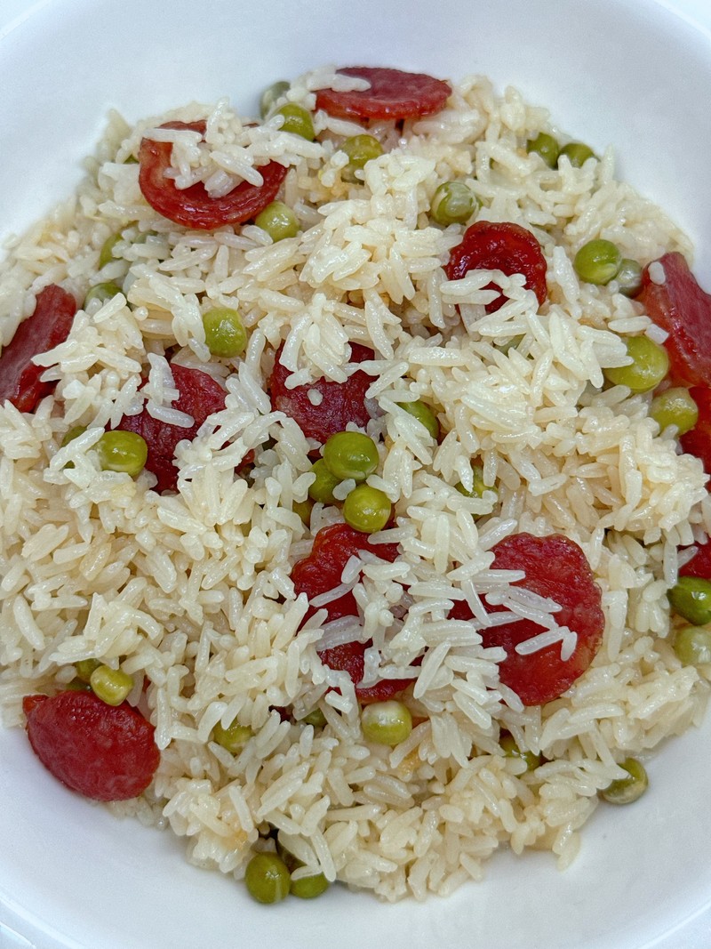 Tags: light soy sauce · pea · peanut oil · rice · rice cooker · salt · sausage · staple food · wok