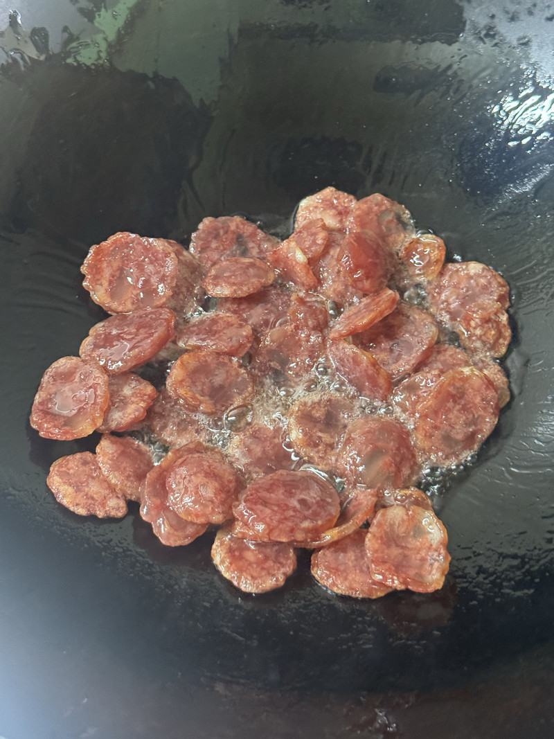 2. Place a skillet or pan over medium heat and add the peanut oil. Once the oil is warm, add the sliced sausage and pan-fry for 2-3 minutes until it becomes slightly crisp and releases its fragrant oils. Remove the sausage from the pan and set it aside, leaving the flavorful oil behind.