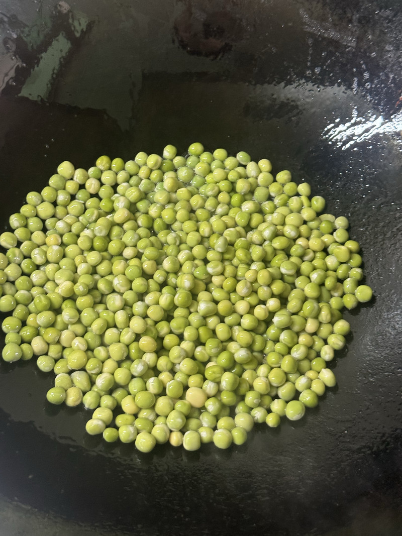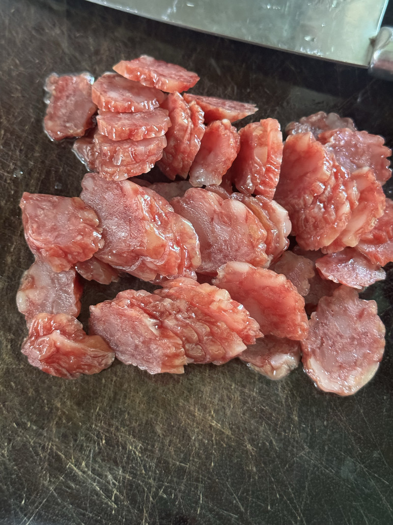 1. First, prepare your toppings. Rinse the sweet peas if they are fresh. Slice the cured sausage into thin, coin-shaped pieces.