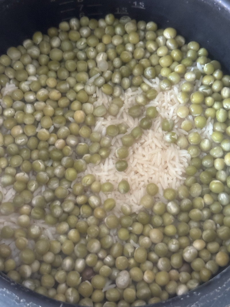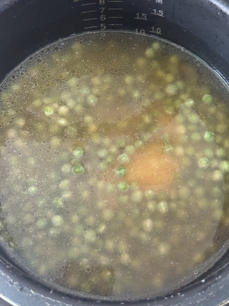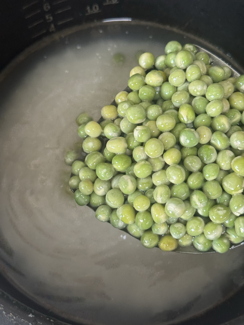 6. Now, add the sautéed peas directly into the pot with the rice and water. Pour in the light soy sauce and stir everything together gently to ensure the seasoning is evenly distributed.