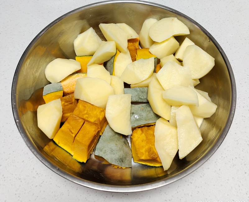 First, prepare your vegetables. After peeling the squash and potatoes, chop them into uniform, bite-sized chunks, roughly 1.5 inches (4 cm) each. This ensures they cook evenly. Give them a quick rinse and set them aside.