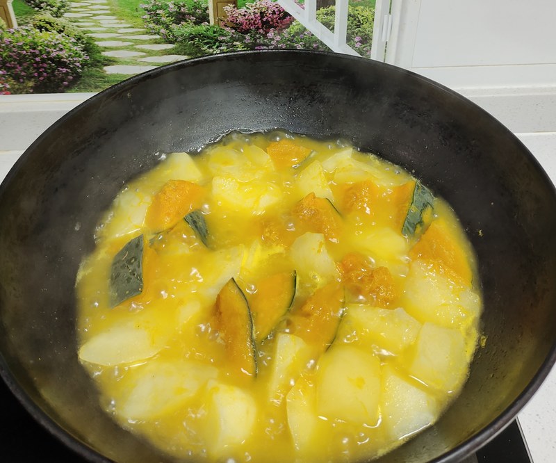 Place a heavy-bottomed pot or a deep skillet over medium-high heat. Add the cooking oil. Once the oil is shimmering, carefully add the squash and potato chunks. Stir-fry them for about a minute until they are lightly coated in oil. Pour in the cooking wine and season with salt. Give everything a good stir, then add enough hot water to come about three-quarters of the way up the vegetables. Bring the water to a boil, then reduce the heat to a medium-low, cover the pot, and let it simmer.