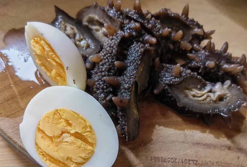 Cut the Main Ingredients: Slice the prepared sea cucumber into manageable pieces, about ½-inch thick. Slice the hard-boiled egg into wedges or rounds. Cut the tomato into similar-sized wedges or pieces. Ensure all cuts are neat for an appealing presentation.