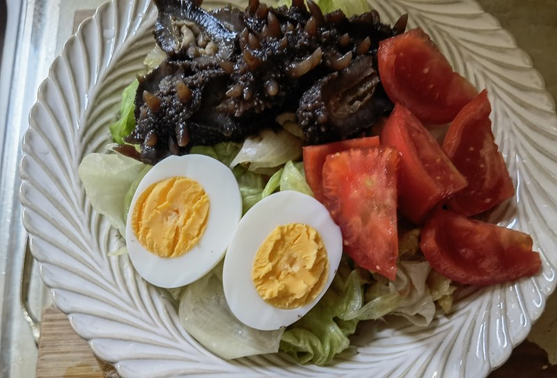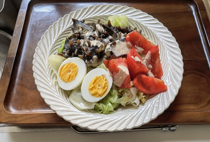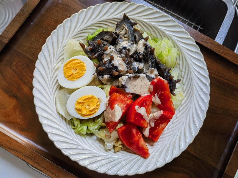 Assemble the Salad: Artfully arrange the sliced sea cucumber, egg, and tomato over the bed of lettuce. Think about creating a visually appealing composition.