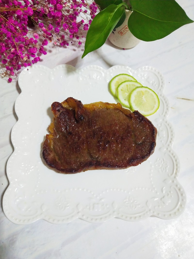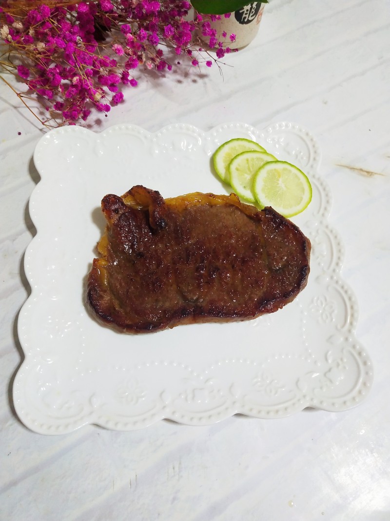 Tags: black pepper sauce · frying pan · hot dishes · lemon slices · oil · steak · Western food