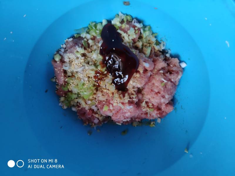 3. In a medium bowl, combine the ground pork, egg white, chopped scallions, grated ginger, oyster sauce, five-spice powder, and white pepper.