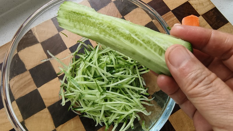 1. Start by preparing your cucumber. Wash it thoroughly. You’ll want to peel about two-thirds of the cucumber skin off in stripes, leaving some skin on for visual appeal and texture. Then, grate the cucumber. Discard the seedy core, as we only need the firm outer flesh.