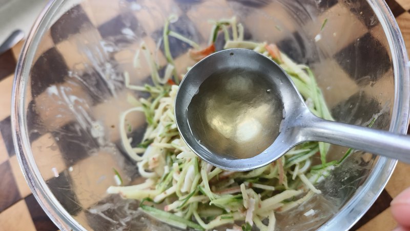4. Combine all your prepared ingredients – the grated cucumber, grated apple, and shredded crab sticks – in a mixing bowl.