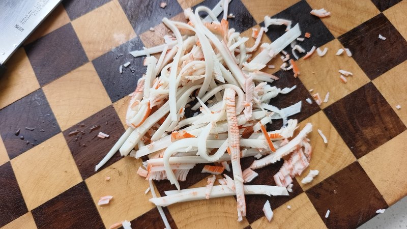 3. If you’re using imitation crab sticks, gently shred them into thin strips with your fingers. If the crab sticks are a bit firm or sticky, you can carefully slice them into thin strands instead.