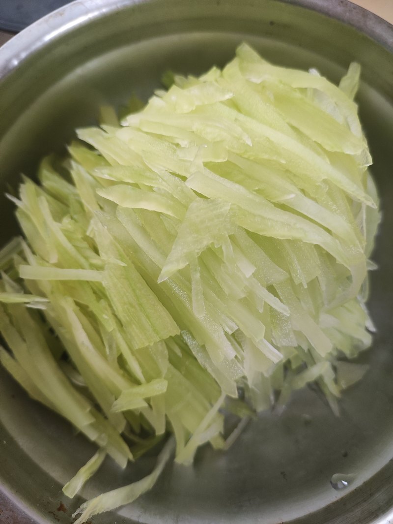 Then, it’s time to prepare the star: cut the stem lettuce into thin, uniform slivers or matchsticks. The smaller you cut them, the more they’ll absorb the dressing.