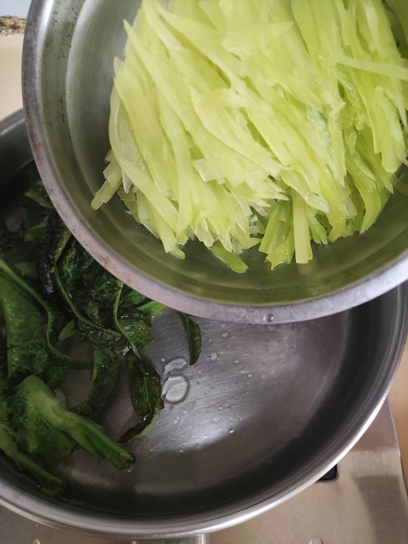 Carefully add the prepared lettuce slivers to the boiling water and blanch them for just about 30-60 seconds. You want them to turn bright green and become tender-crisp, not mushy.