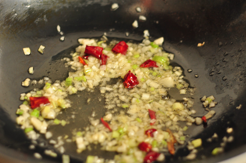 Place a soup pot or Dutch oven over medium heat and add a splash of oil. Add the minced ginger, garlic, scallion whites, and dried chilies. Sauté for about 30-60 seconds until a wonderful aroma fills your kitchen.
