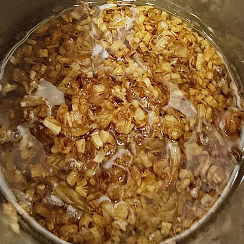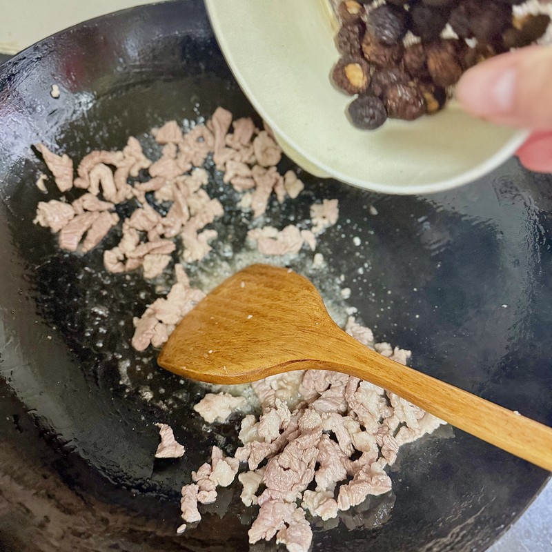 In a medium-sized pot or Dutch oven, heat a tablespoon of neutral oil over medium-high heat. Add the sliced pork and sauté until it’s lightly browned. Add the sliced shiitake mushrooms and minced garlic, and stir-fry for about a minute until everything is wonderfully fragrant.