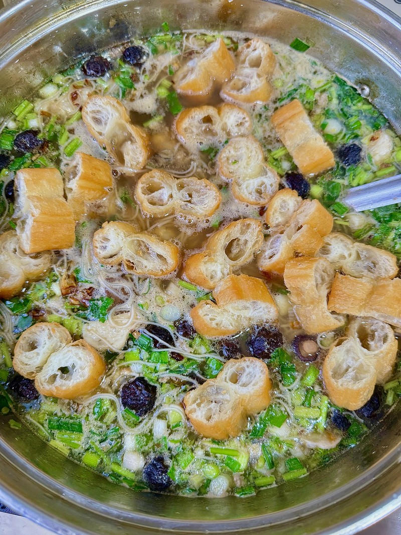 Ladle the hot pottage into bowls. Garnish with fresh scallions and an extra sprinkle of fried shallots. It is traditionally served with crispy fried dough sticks on the side, perfect for tearing and dipping into the soup.