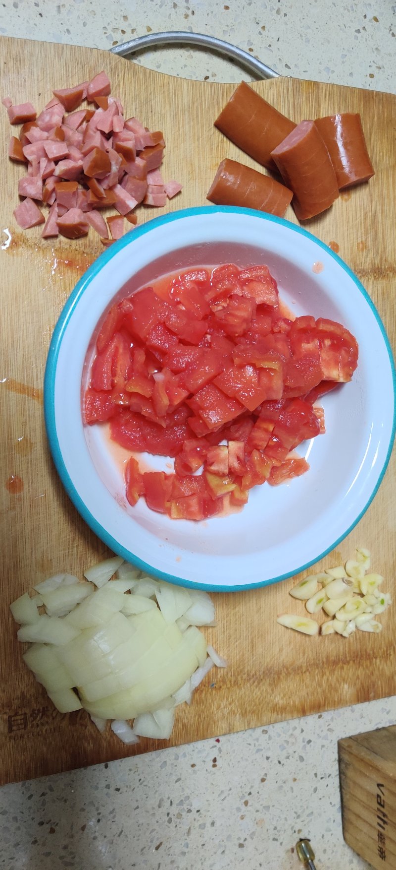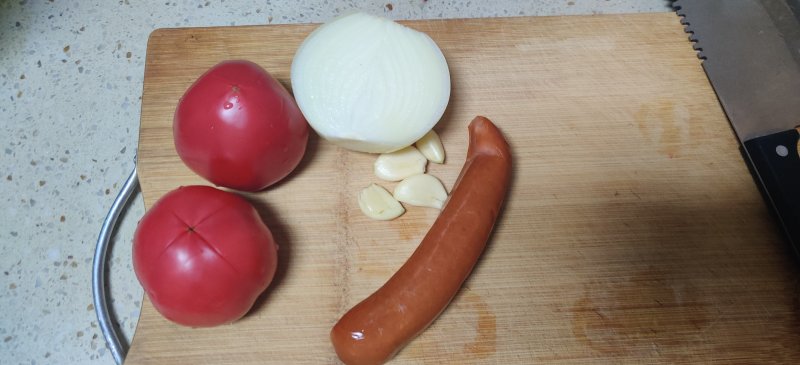 4. Dice the peeled tomatoes, onion, and garlic sausage into small, bite-sized pieces. Mince the garlic cloves. Having everything prepped makes the cooking process smooth and fast.