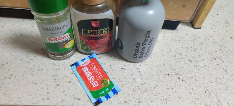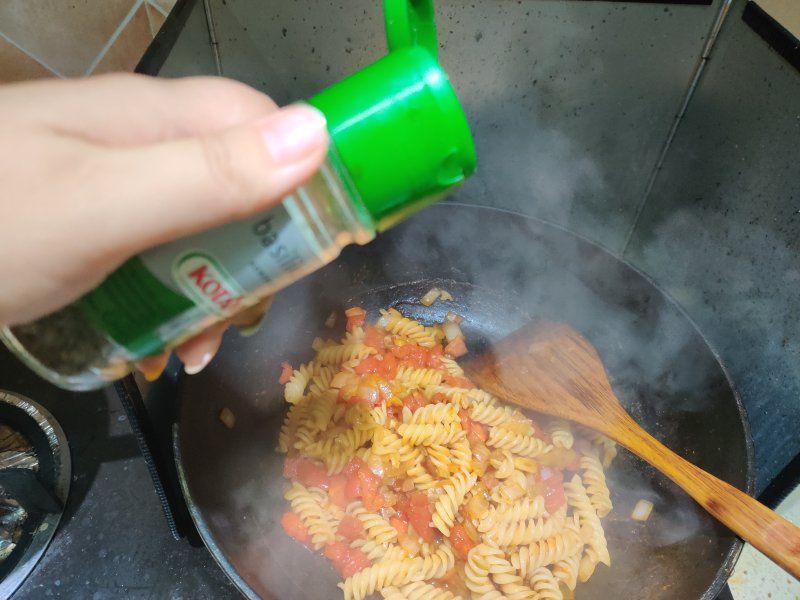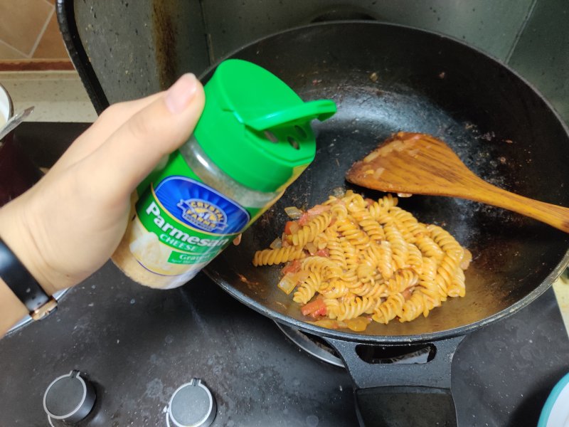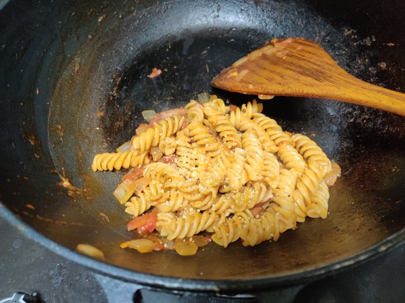 Tags: black pepper sauce · cheese powder · dinner · garlic · ketchup · lunch · non-stick pan · olive oil · onion · pasta · staple food · table salt · tomato · Western food
