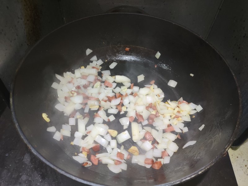 8. Toss in the diced onion and continue to cook, stirring occasionally, until the onions soften and become translucent.