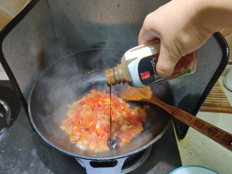 10. Squeeze in your desired amount of tomato paste (or ketchup) and a dash of black pepper sauce (or freshly ground black pepper). Stir everything together and let it simmer for a minute to meld the flavors.