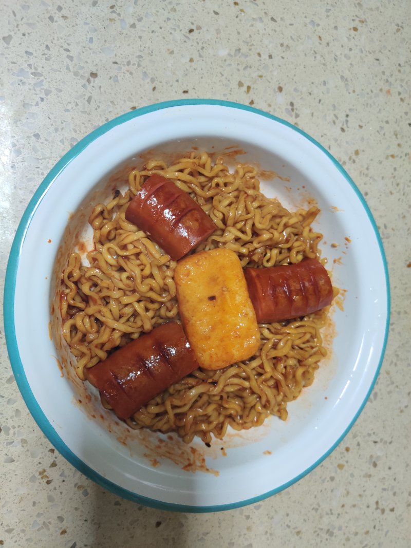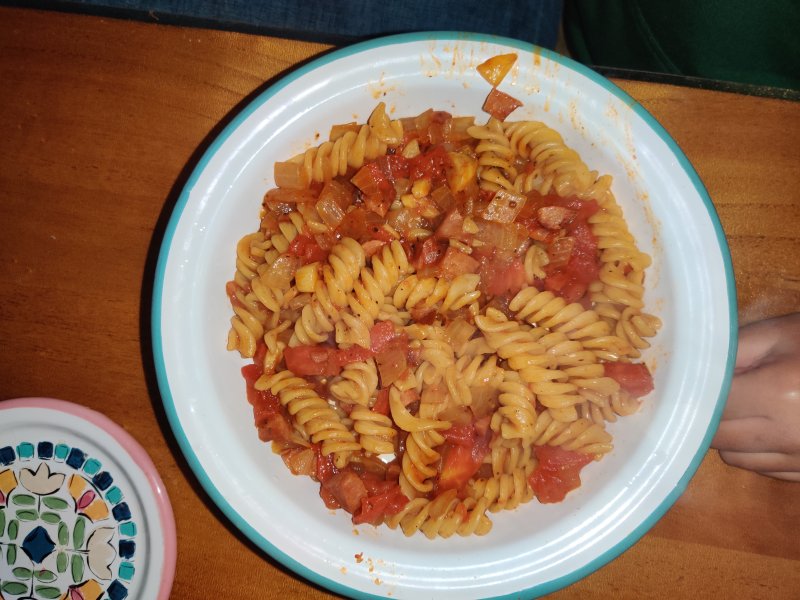 Tags: black pepper sauce · cheese powder · dinner · garlic · ketchup · lunch · non-stick pan · olive oil · onion · pasta · staple food · table salt · tomato · Western food