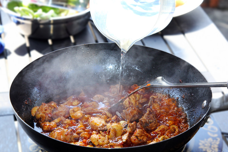 Once the chicken and sauce are well combined and aromatic, pour in 600ml (about 2.5 cups) of hot water or, for a richer taste, chicken stock. Bring the liquid to a boil, then reduce the heat to a medium simmer. Cover the pot and let it braise for about 30 minutes.
