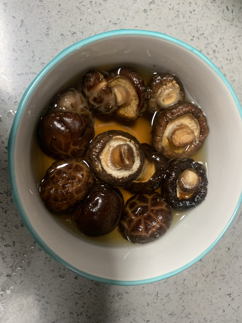Place the dried shiitake mushrooms in a bowl and cover them with hot water to rehydrate.