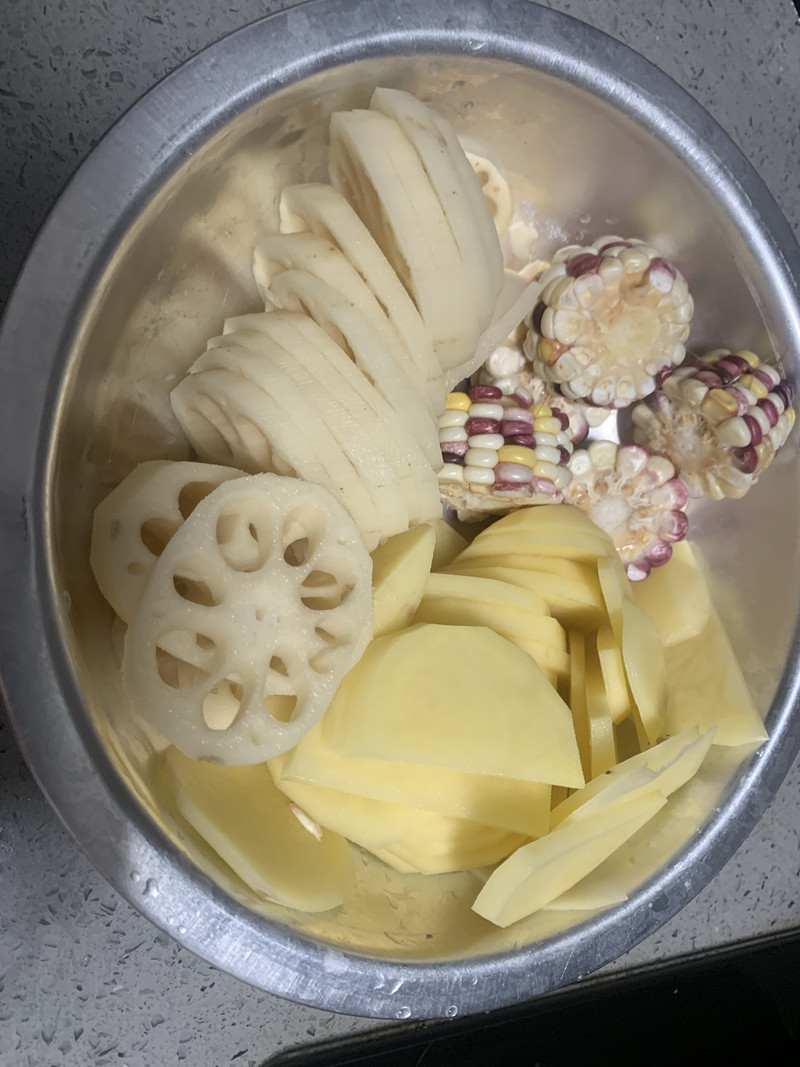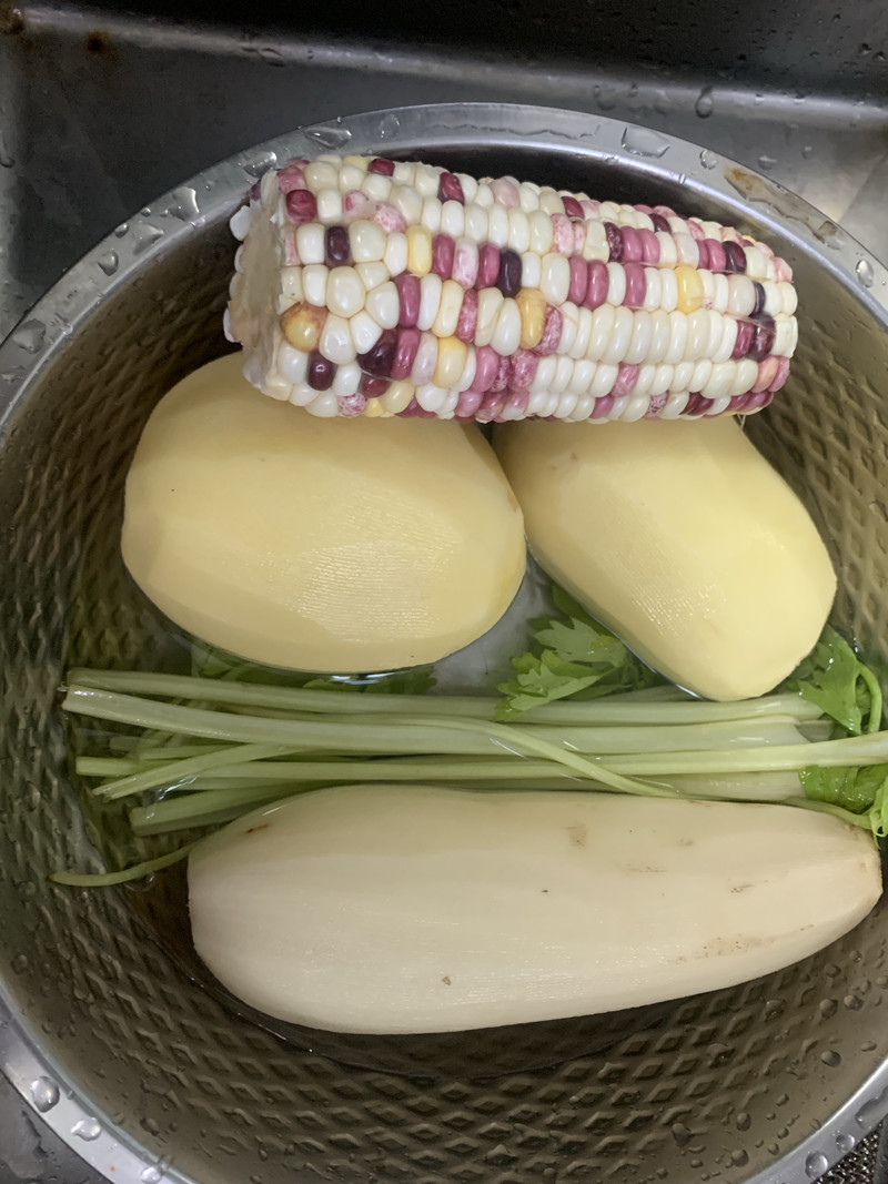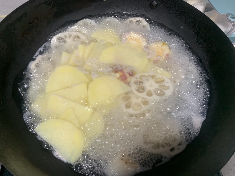 Bring a large pot of water to a boil. Add the potatoes, lotus root, corn, and rehydrated shiitake mushrooms. Cook for about 5-7 minutes until they are about 70% cooked (tender but still with a firm bite). Use a slotted spoon to remove them from the water and set them aside.