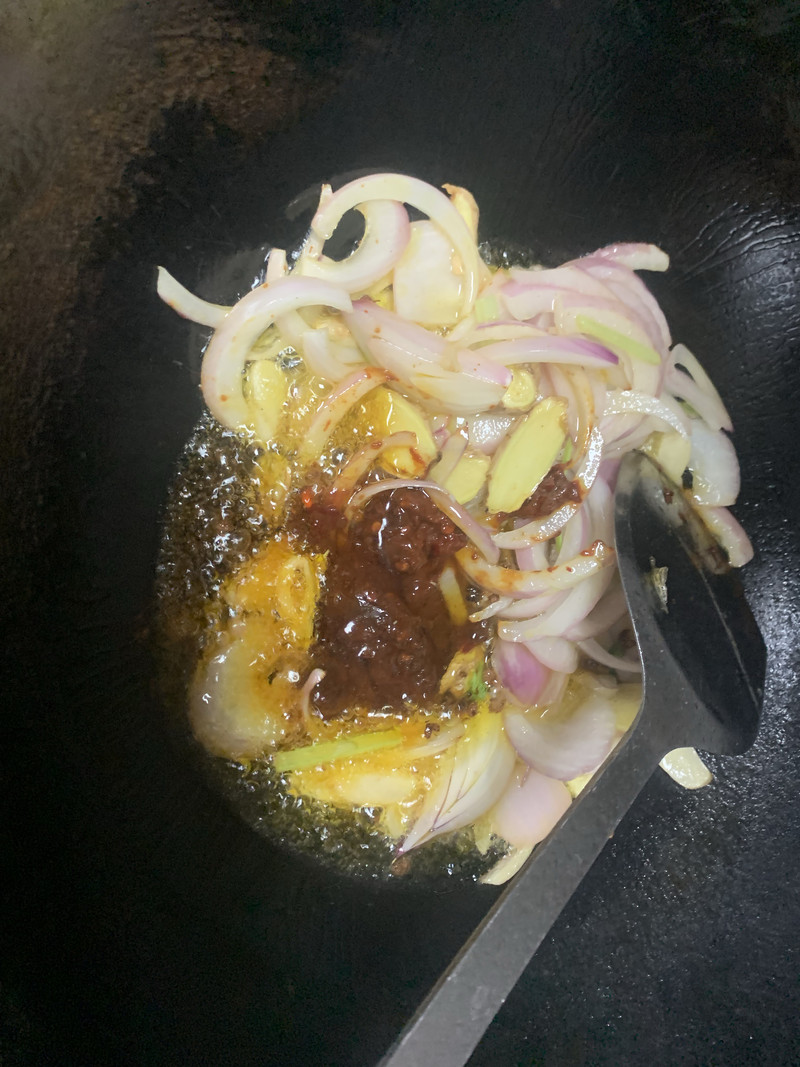 Stir-fry for another minute, breaking up the paste, until the oil turns a beautiful reddish color and the aroma is irresistible. Add a pinch of salt.