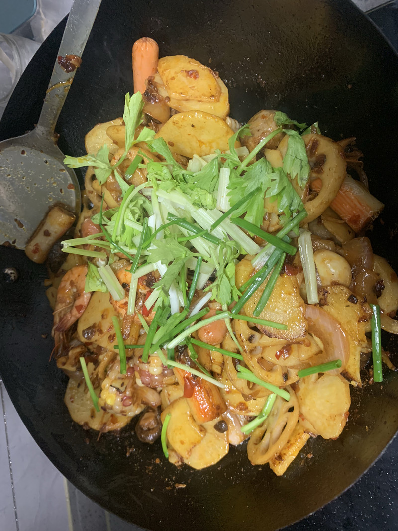 Turn the heat up to high and toss everything together, coating it all in that delicious, spicy sauce. Stir-fry for 5-6 minutes, allowing any excess water from the vegetables to evaporate. You’re aiming for a “dry” pot, not a saucy one. Now, add the shrimp and celery pieces.