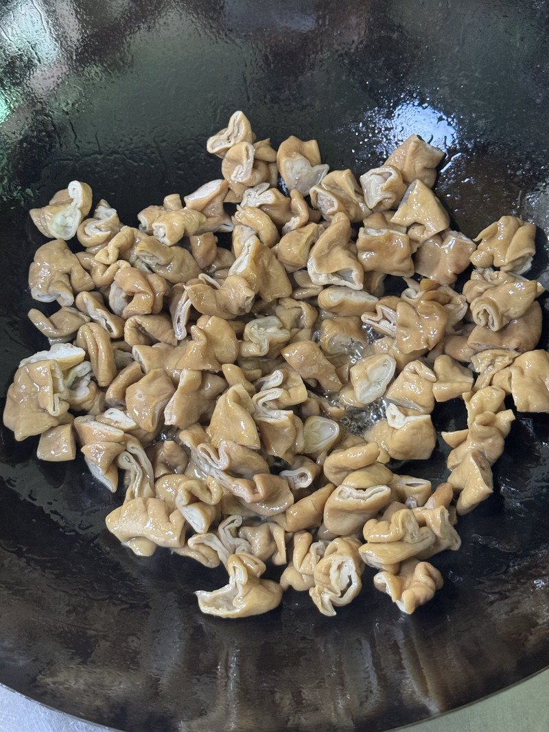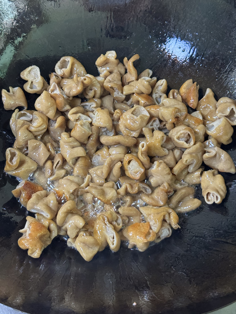 2. Sear the Pork: Place a large skillet or wok over medium-high heat. Add the peanut oil and let it get hot until it shimmers. Carefully add the sliced pork intestines to the pan in a single layer.