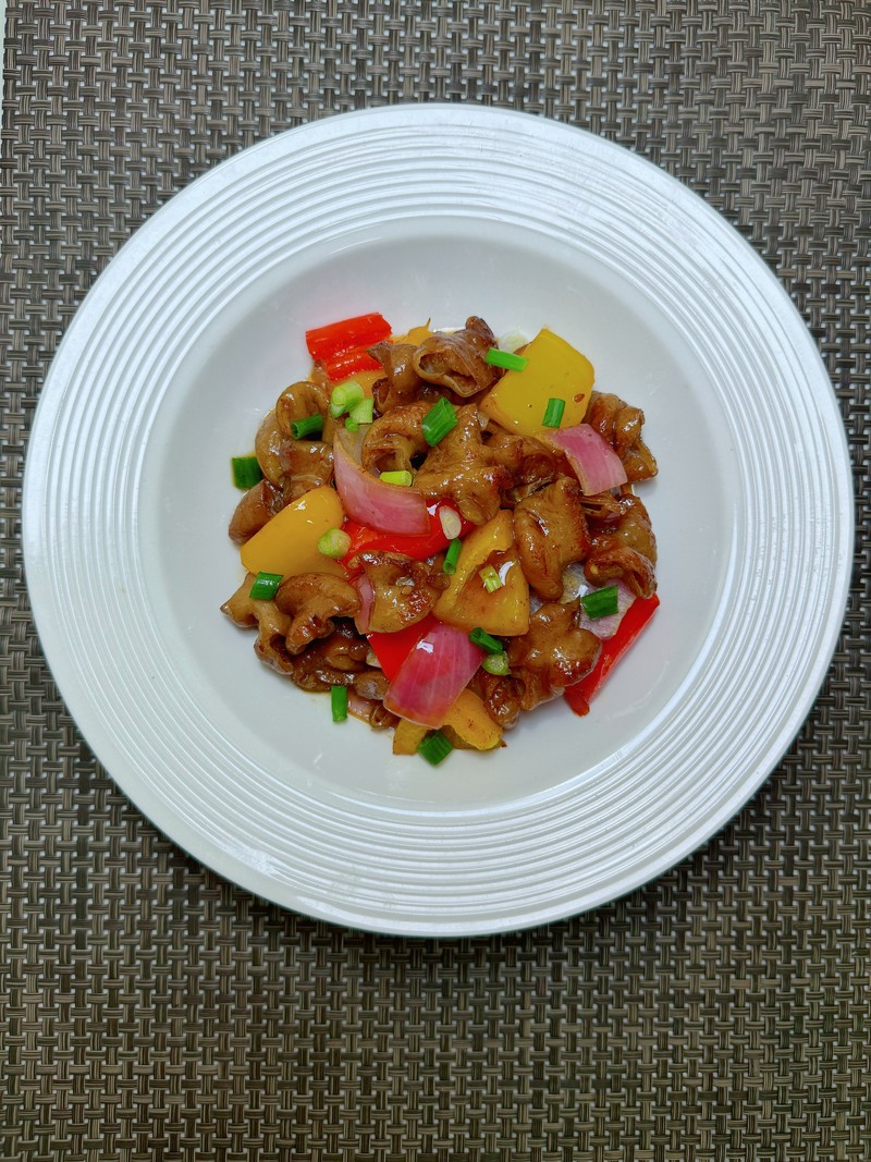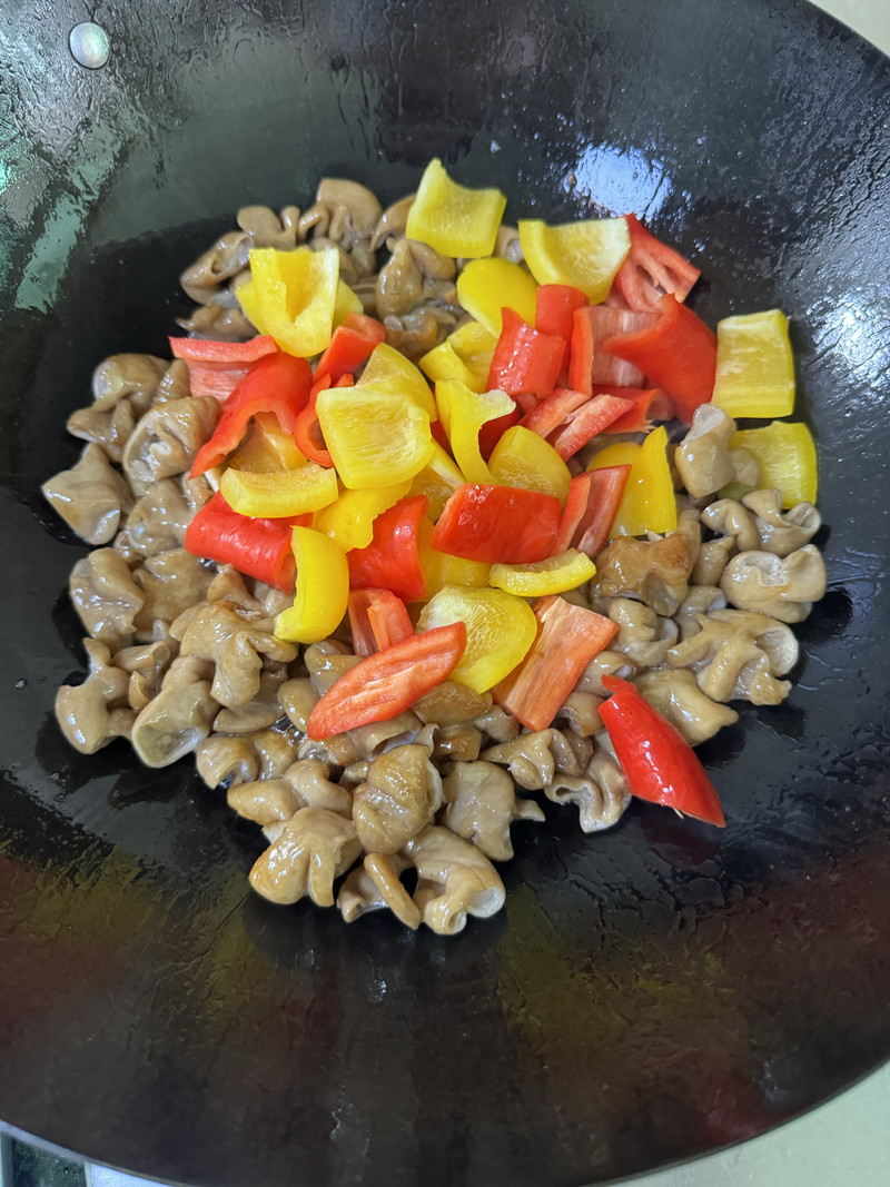 1. Prep Your Ingredients: If your braised pork intestines came in large pieces, slice them into bite-sized rings or chunks, about 1/2-inch thick. Pat them dry with a paper towel—this will help them get nice and crispy in the pan. Core and seed the bell peppers and cut them into 1-inch squares. Peel the onion and cut it into similar-sized pieces.