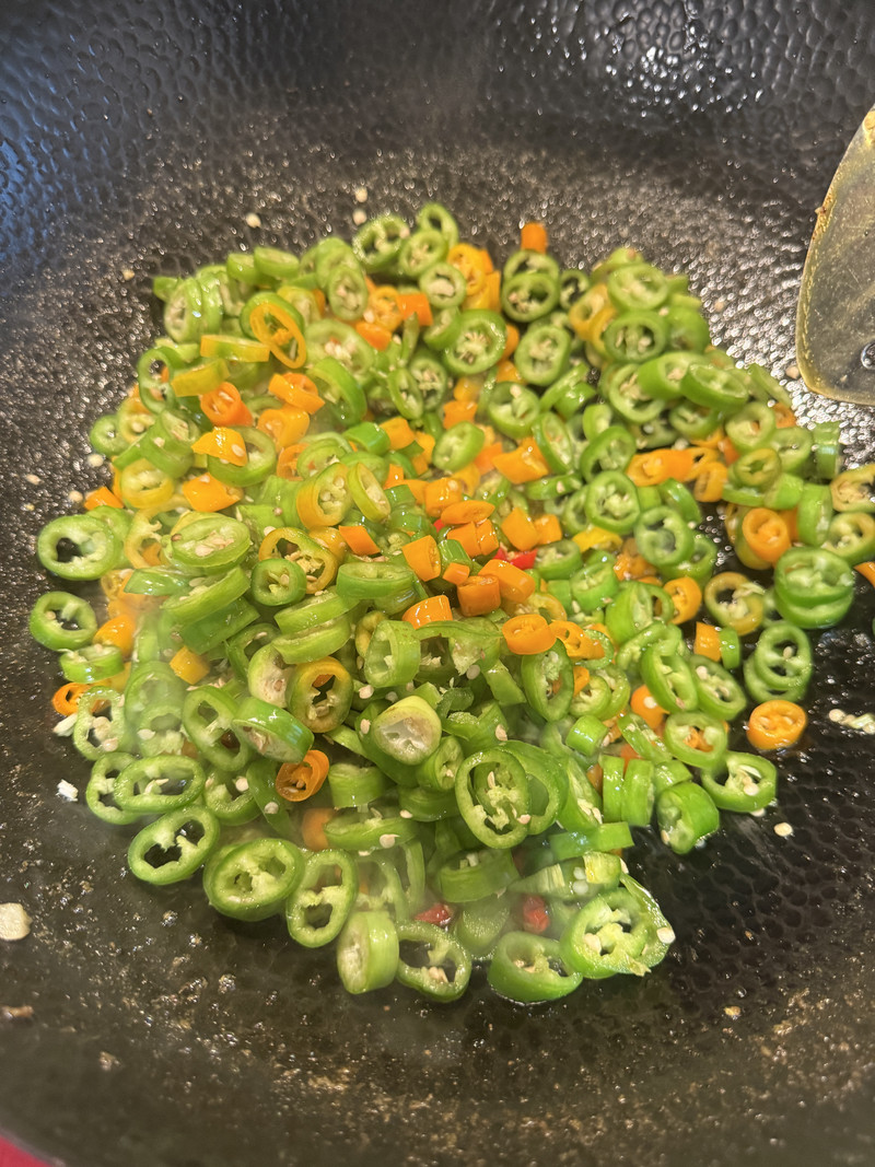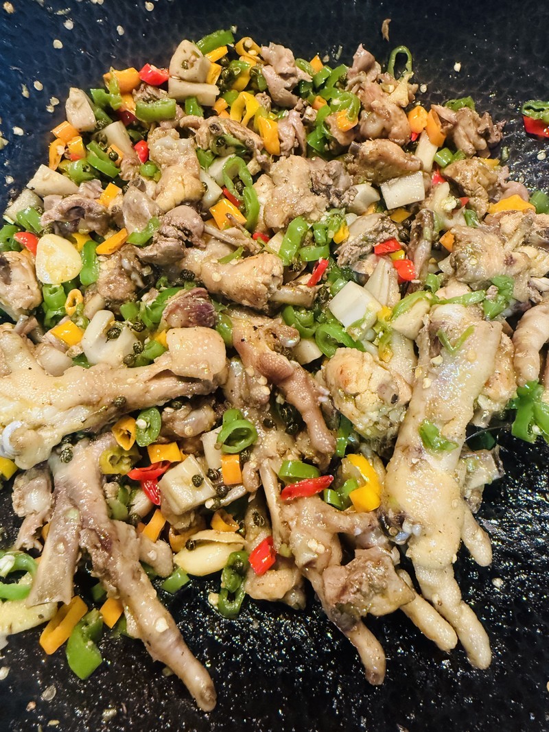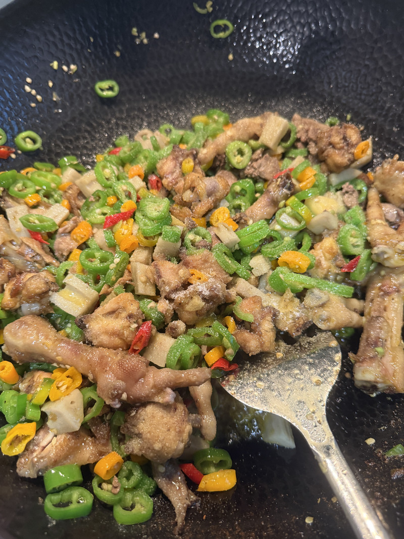 Stir-fry the peppers for 1-2 minutes. You want them to be slightly tender but still vibrant and with a bit of a crunch. Now, add all the fried chicken, offal (if using), and lotus root back into the wok.