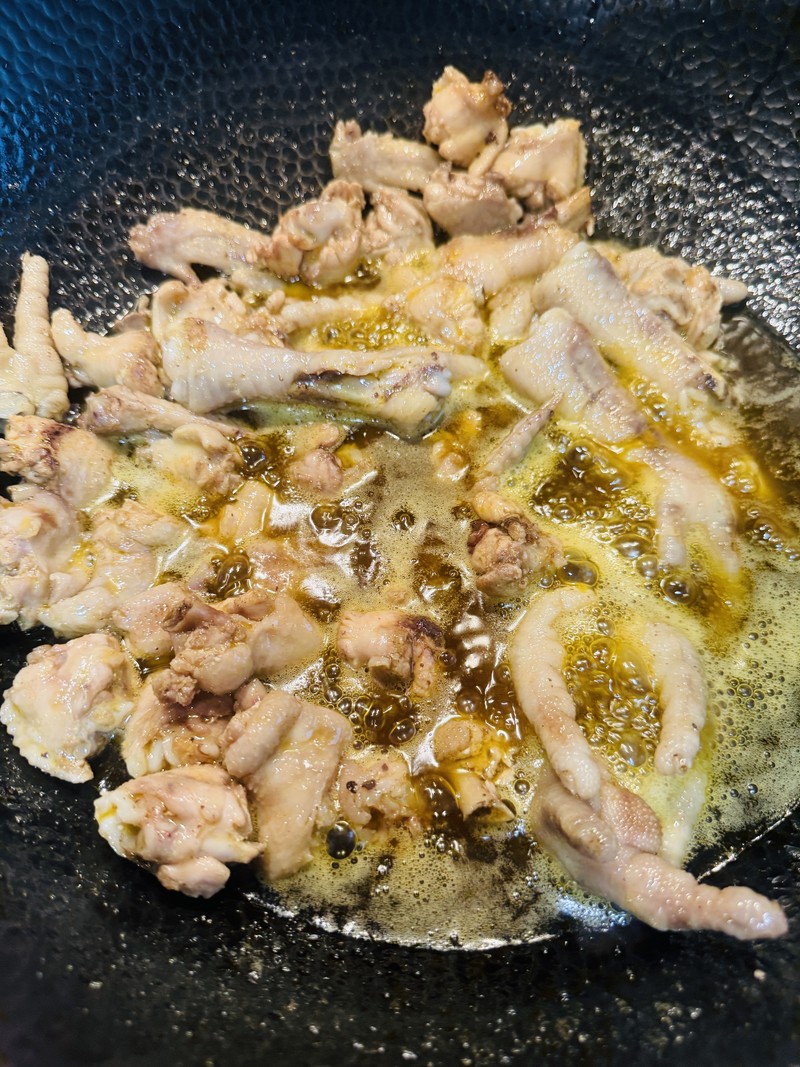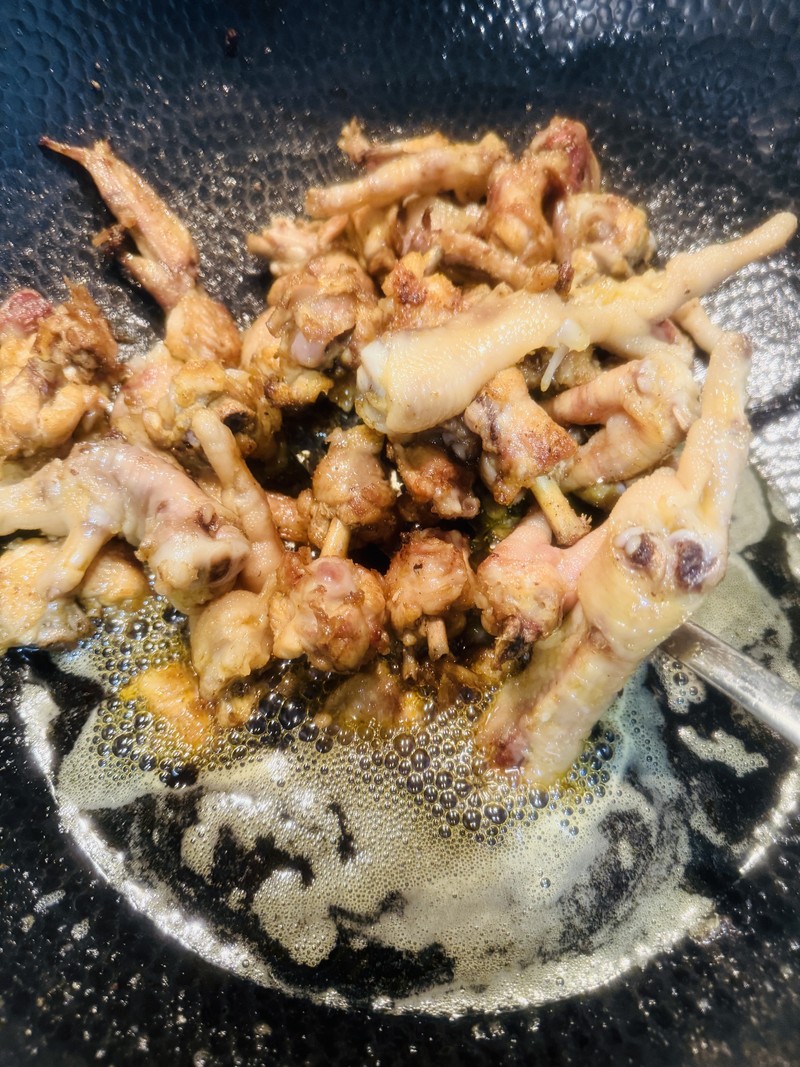 If you are feeling adventurous and using chicken offal (like gizzards or hearts), you can fry them separately now for a few minutes until cooked through and slightly crisped. Remove and set aside with the other chicken parts.
