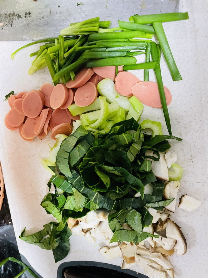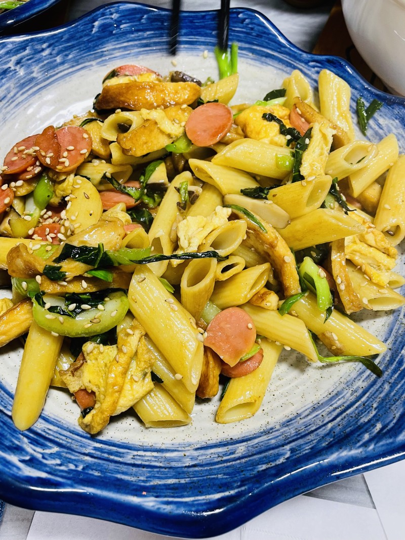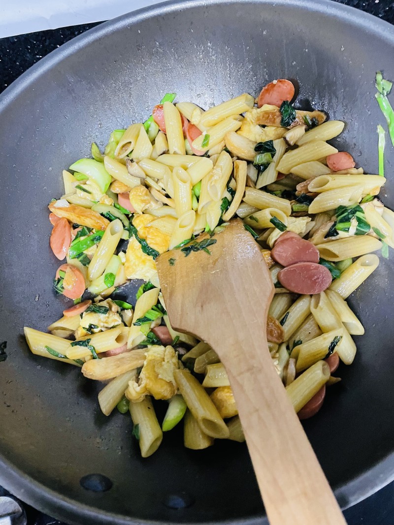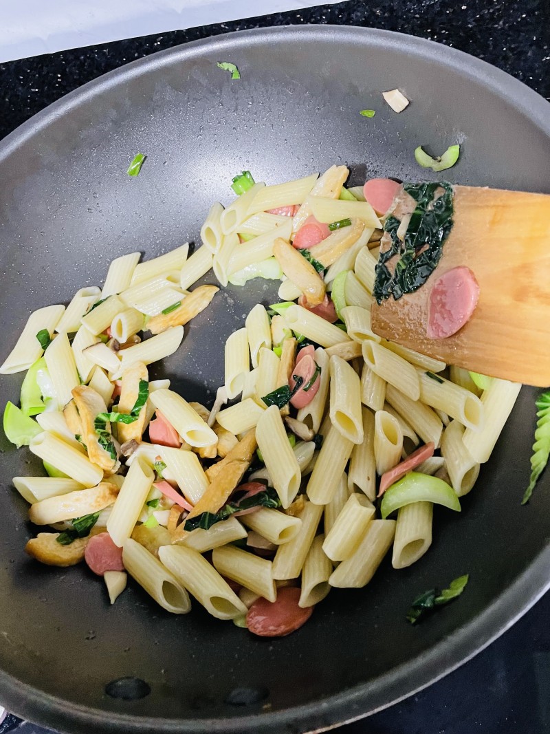 In the same skillet, add the sliced sausage and stir-fry for a minute or two until it gets a little color. Toss in the sliced mushrooms and the green vegetable. Continue to stir-fry for another 2-3 minutes until the mushrooms are tender and the greens are just wilted. Now, add the cooked spaghetti and fish tofu to the skillet with the veggies.