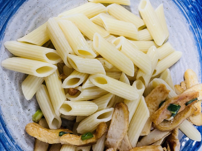 While the pasta is boiling, use the time to prepare your other ingredients. This is the key to a speedy stir-fry! Thinly slice the sausage, mushrooms, and your chosen green vegetable. You can also dice them if you prefer. Finely chop the green onion.
