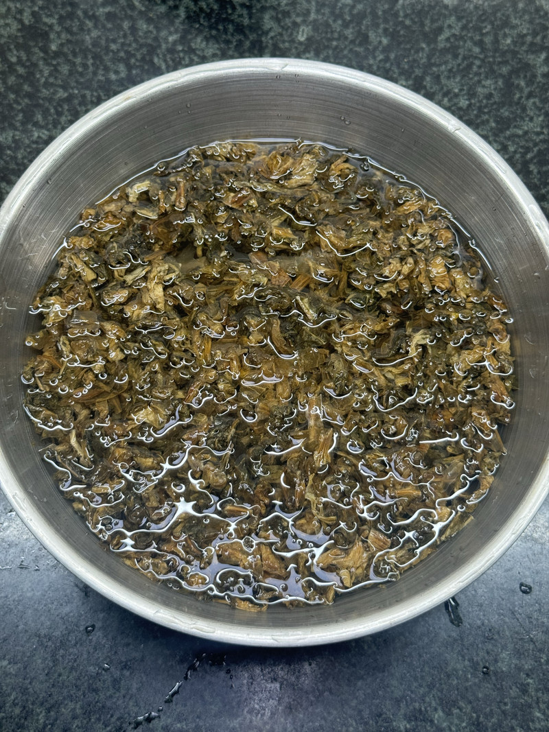 9. Now, add the rehydrated preserved mustard greens to the pot.