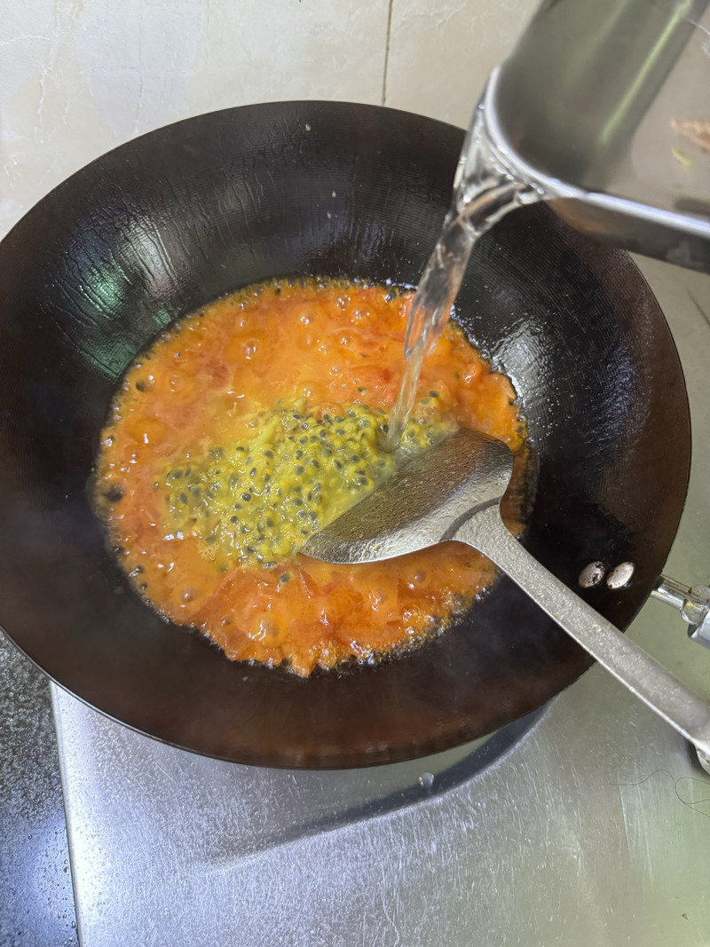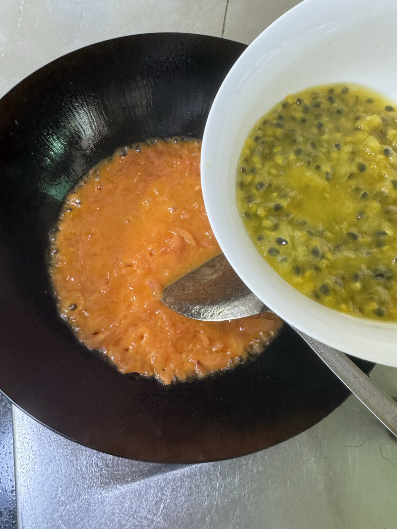 Now, pour the passion fruit pulp and juice into the pot with the tomatoes. Give it a good stir to combine.