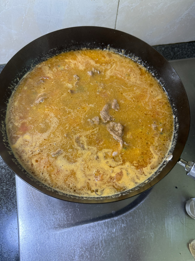 It’s time for the beef. Increase the heat slightly to bring the sauce to a steady simmer. Add the marinated beef slices to the pot, spreading them out in a single layer as much as possible to prevent clumping.